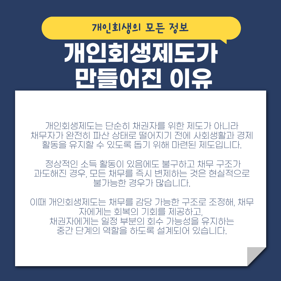 개인회생제도는 단순히 채권자를 위한 제도가 아니라, 채무자가 완전히 파산 상태로 떨어지기 전에 사회생활과 경제활동을 유지할 수 있도록 돕기 위해 마련된 제도입니다. 정상적인 소득 활동이 있음에도 불구하고 채무 구조가 과도해진 경우, 모든 채무를 즉시 변제하는 것은 현실적으로 불가능한 경우가 많습니다.