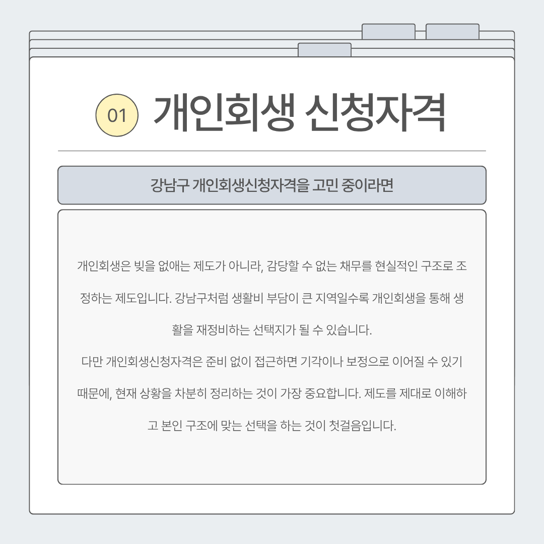 강남구 개인회생신청자격은 하나의 조건만으로 결정되지 않습니다.