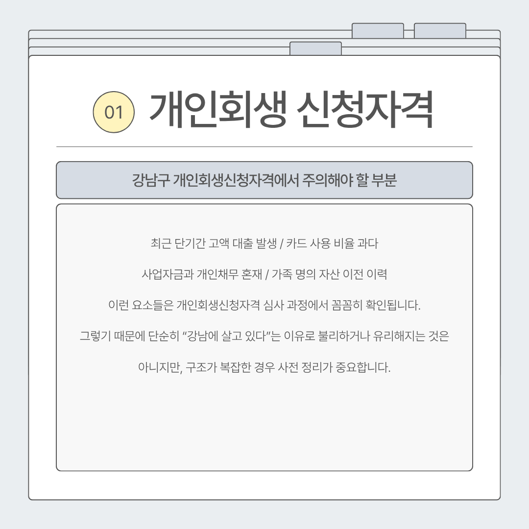 이런 요소들은 개인회생신청자격 심사 과정에서 꼼꼼히 확인됩니다. 그렇기 때문에 단순히 “강남에 살고 있다”는 이유로 불리하거나 유리해지는 것은 아니지만, 구조가 복잡한 경우 사전 정리가 중요합니다.